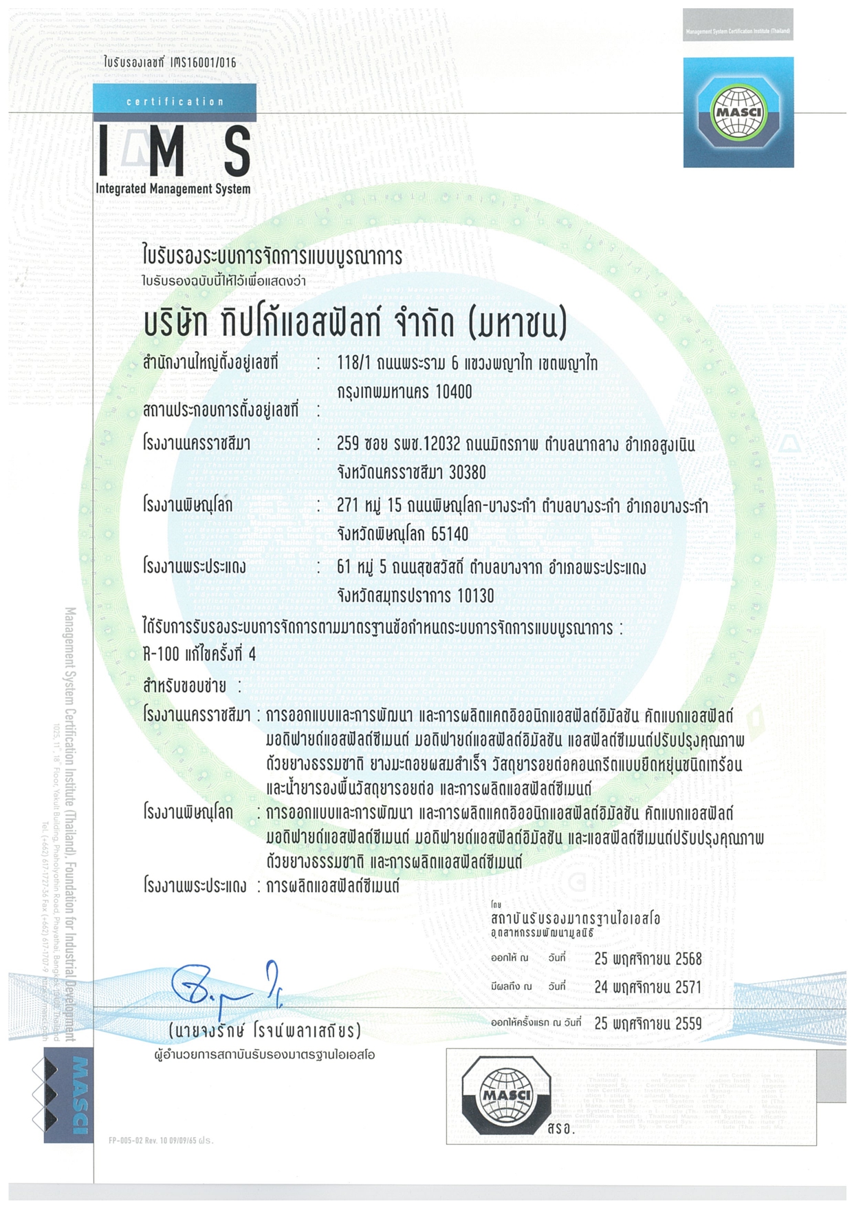 บริษัท ทิปโก้แอสฟัลท์ จำกัด (มหาชน) ได้รับการรับรองระบบการจัดการตามมาตรฐานข้อกำหนดระบบการจัดการแบบบูรณาการ : R-100 แก้ไขครั้งที่ 4